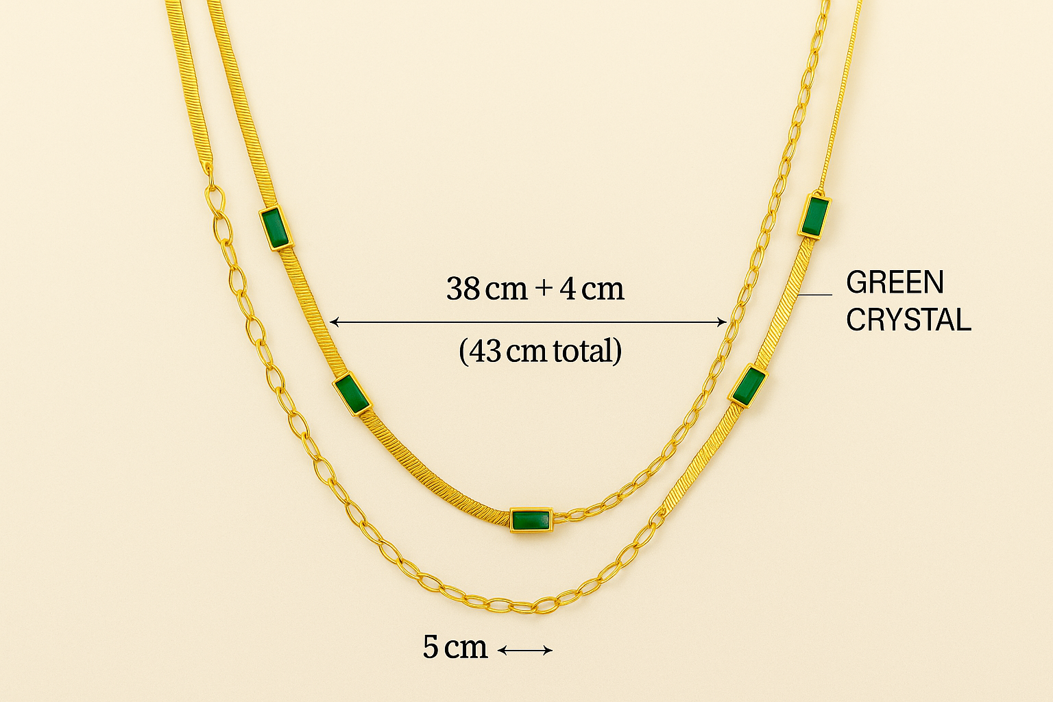 This necklace is crafted from stainless steel, featuring a green rectangular crystal pendant. The dual-layer design combines modern aesthetics with timeless charm. The adjustable chain ensures a comfortable fit for various styles and occasions. 🌟