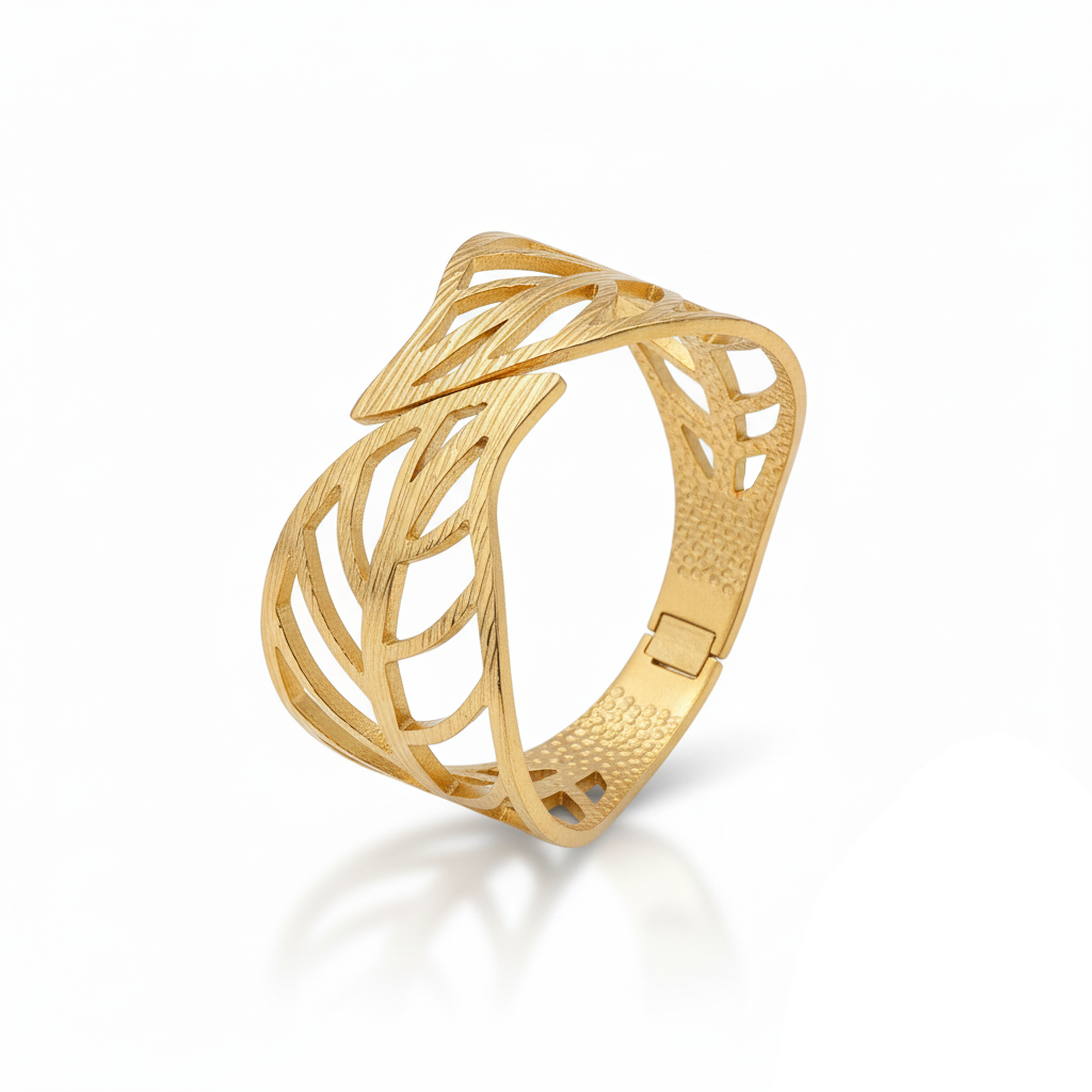 This bangle features a luxurious leaf pattern, crafted from 18K gold-plated stainless steel. The open-cuff design ensures easy wear and a contemporary look. Its chunky silhouette adds confidence and personality to any outfit. Perfect for everyday wear and special occasions, this bracelet is waterproof, anti-tarnish, and hypoallergenic.