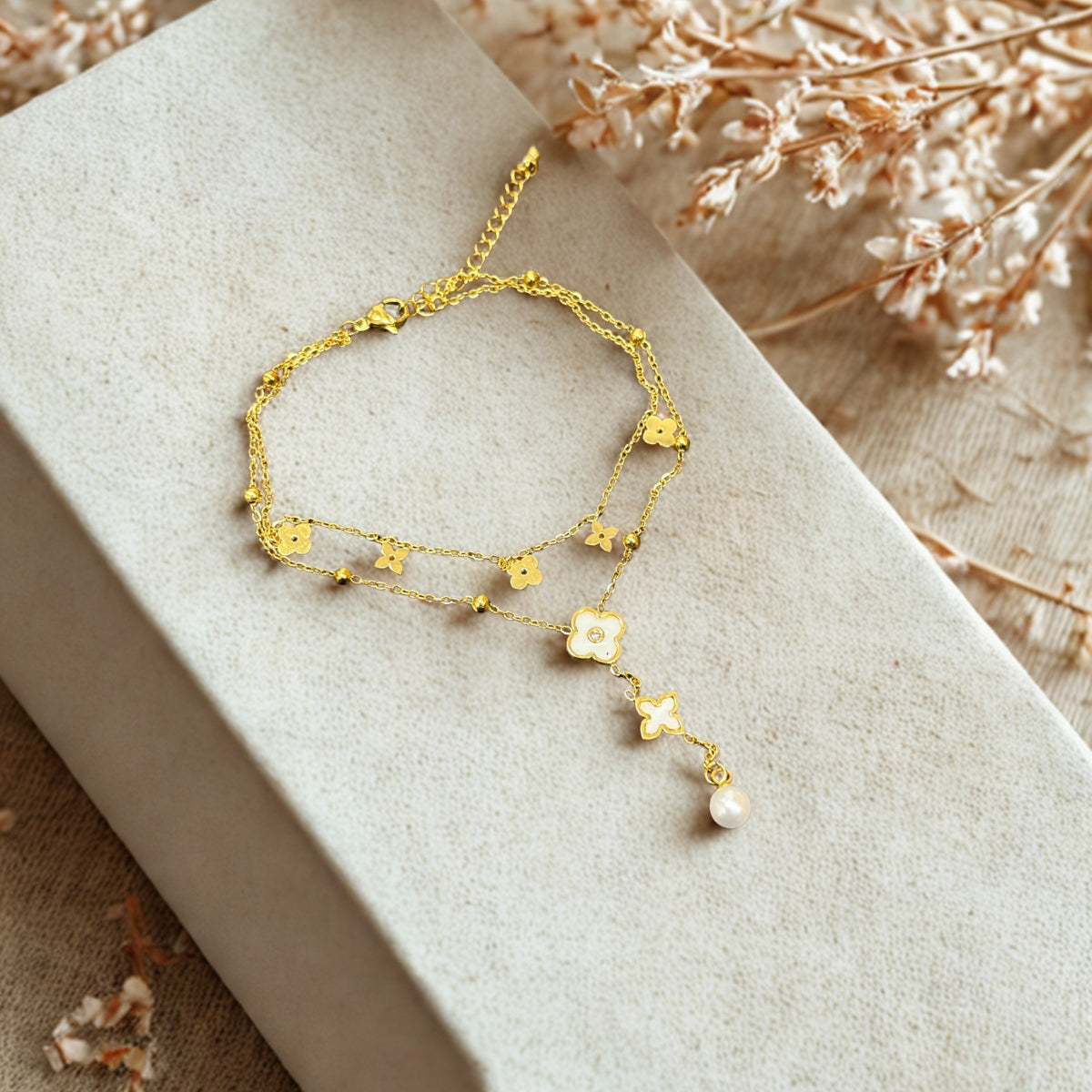 This double-layer adjustable ankle bracelet is perfect for women. It features pearl beads, adding a touch of elegance. The anklet is waterproof, making it suitable for various occasions.
