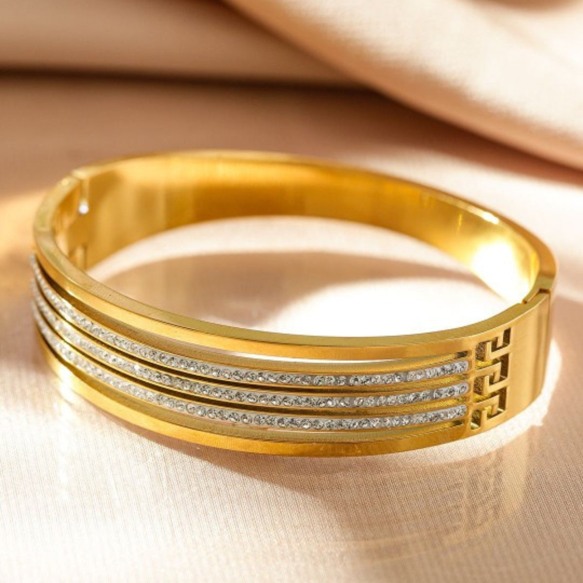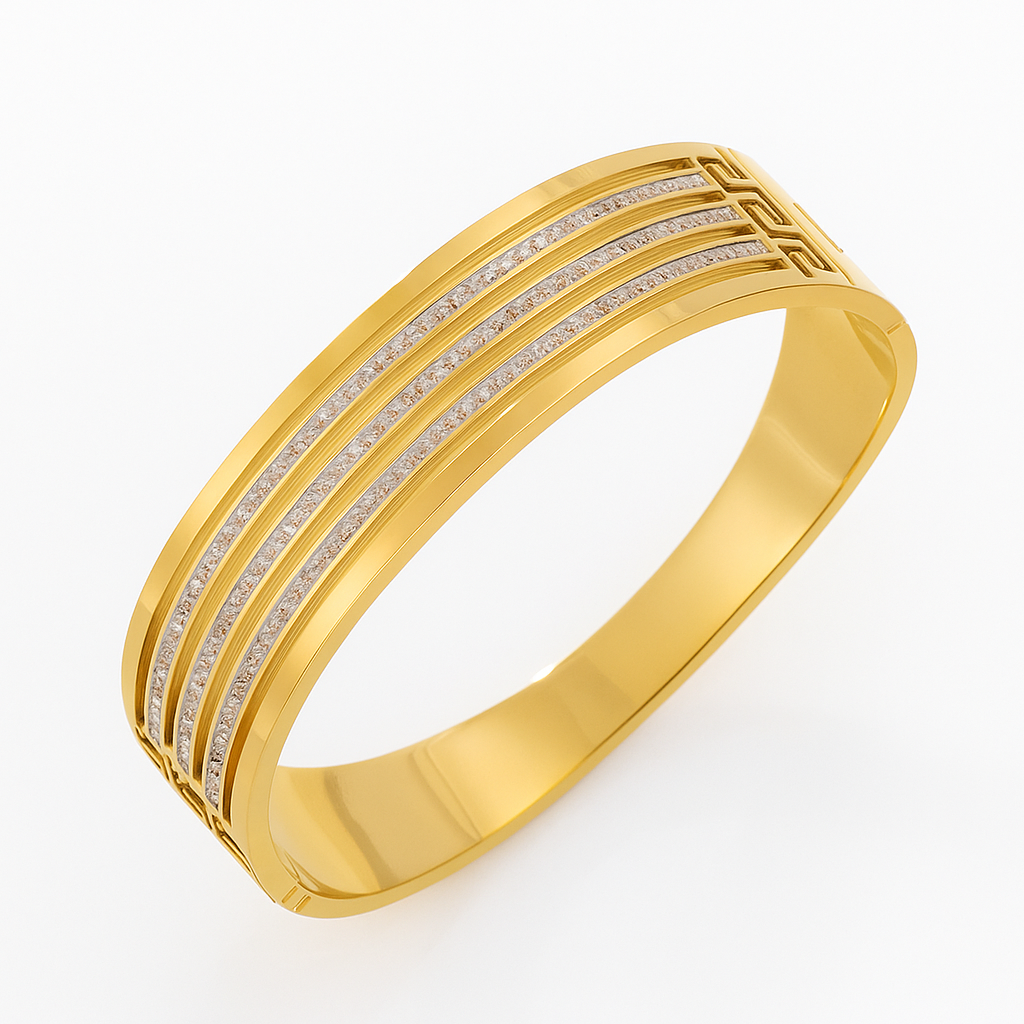 This bracelet is perfect for birthdays or anniversaries. It combines elegance with symbolism and is ideal for daily wear. The adjustable broad bangle with sparkling stones makes it a versatile accessory for party, wedding, and everyday wear.