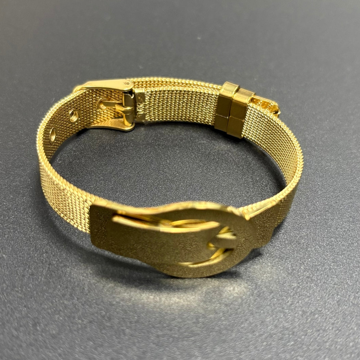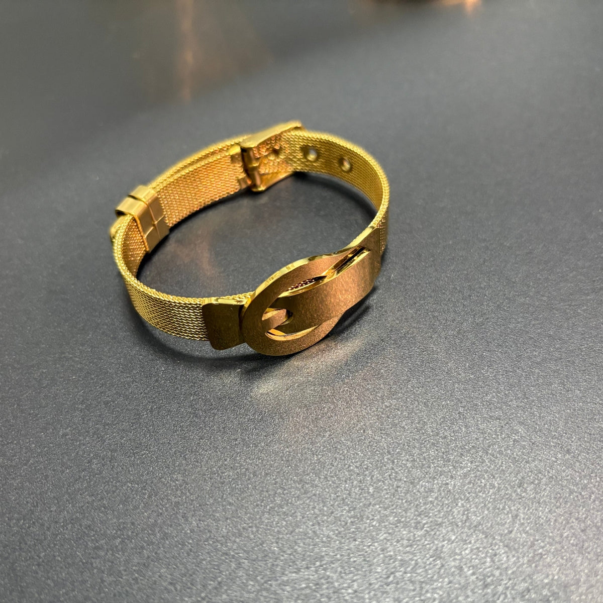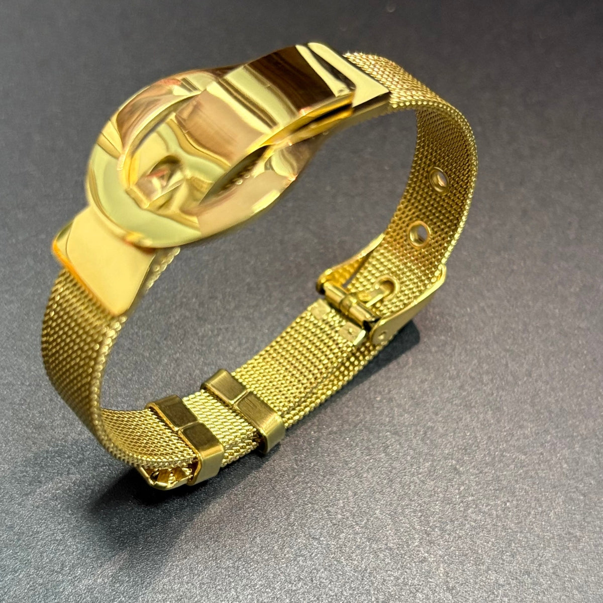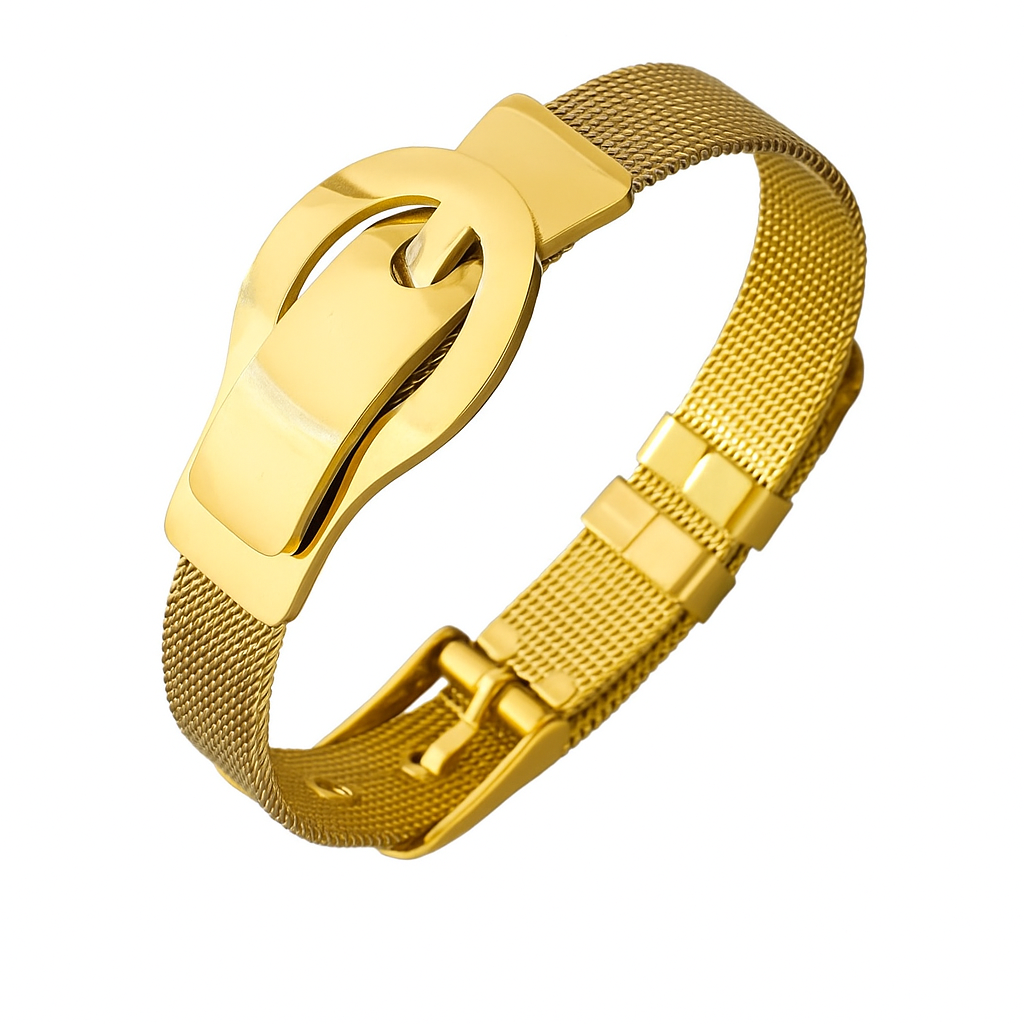 This designer bracelet blends modern elegance with everyday versatility. It features a sleek stainless steel mesh band and a polished gold buckle detail. The delicate crystal accent adds a touch of sparkle, making it luxurious without being overstated. Perfect for casual and dressy outfits, it ensures a refined, contemporary look.